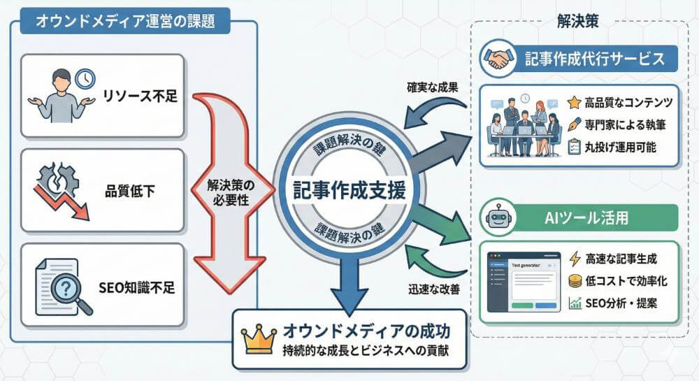 また、Googleの検索アルゴリズムは年々進化しており、単に文字数を埋めるだけでは上位表示は望めません。E-E-A-T(経験・専門性・権威性・信頼性)を満たした、読者に役立つコンテンツが求められています。こうした課題を解決するための支援策には、大きく分けて「代行サービス」と「ツール」の2つの選択肢があります。