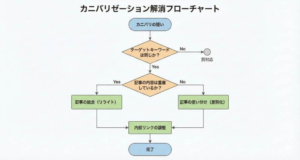 URLが異なるのに、中身が完全に(またはほぼ)同じページが複数存在すること。システムの設定ミスなどで意図せず発生することが多いです。 - キーワードカニバリゼーション(Keyword Cannibalization):