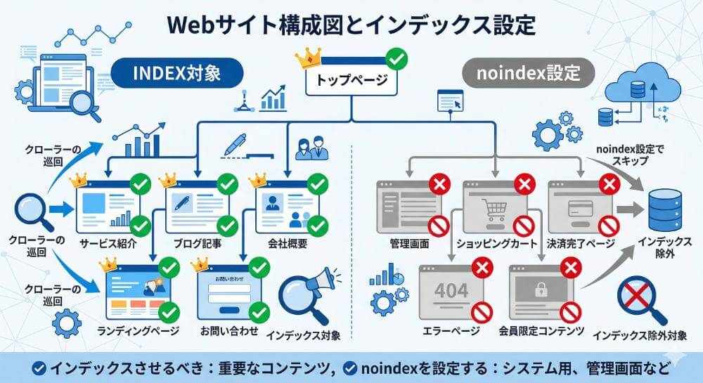 不要なページをnoindexで除外すれば、検索エンジンは浮いたリソースを「本当にインデックスさせたい重要なページ」の巡回に充ててくれるようになります。