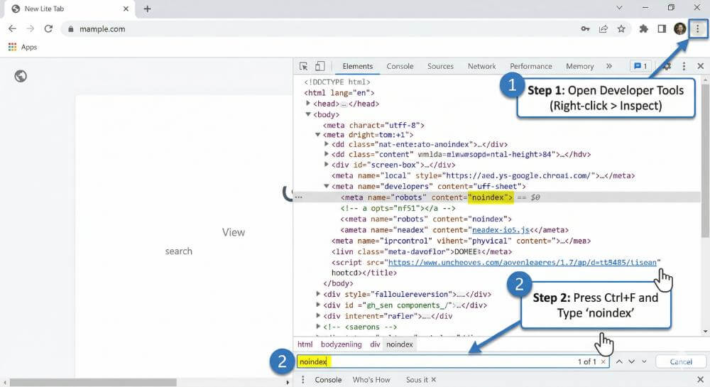 エンジニアではない担当者の方でも、基本のコードさえ知っていれば、検証ツールで設定の正誤を確認できます。noindexはHTMLの<head>セクション内に記述します。