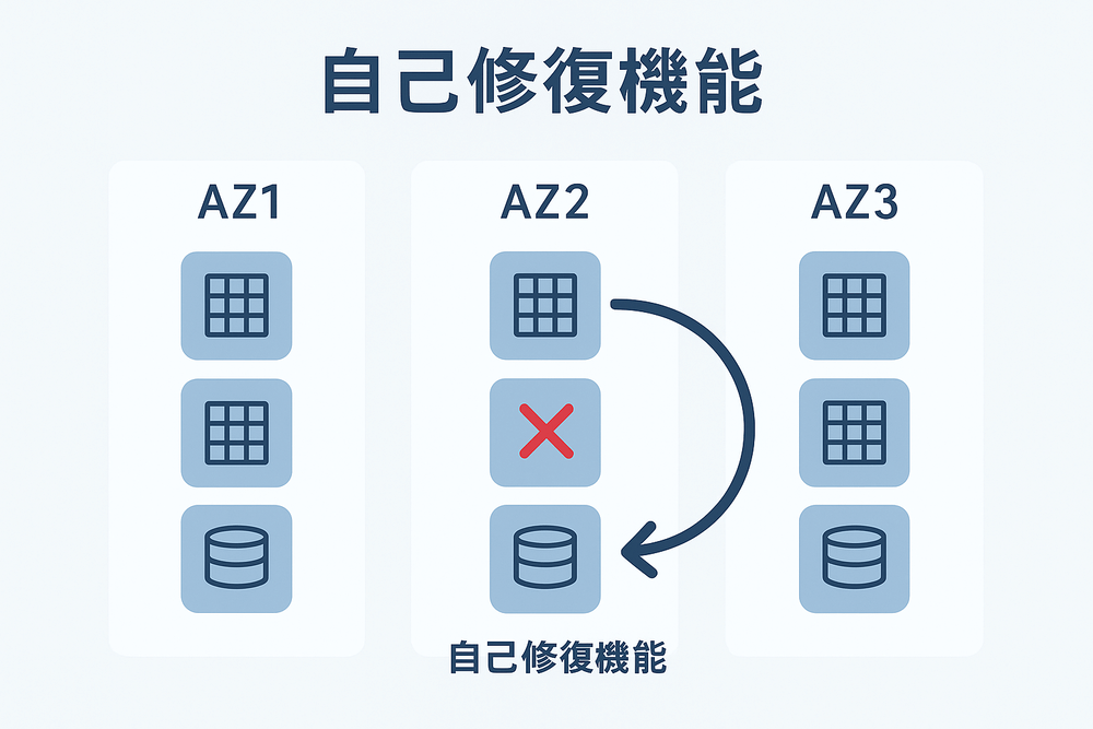Auroraのストレージは、データを3つのアベイラビリティゾーン(AZ)にわたり、それぞれ2つずつ、合計6つのコピーを自動的に作成します。これにより、仮に1つのAZが完全に停止し、さらに追加で1つのコピーが失われても、書き込み処理は継続でき、読み取り処理も影響を受けません。データ消失のリスクが極めて低いのが特徴です。